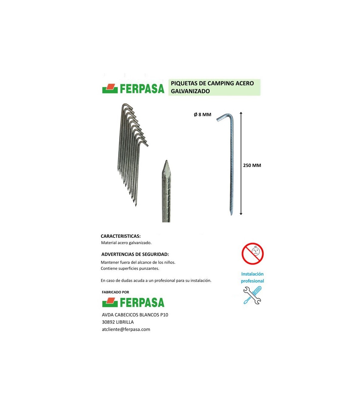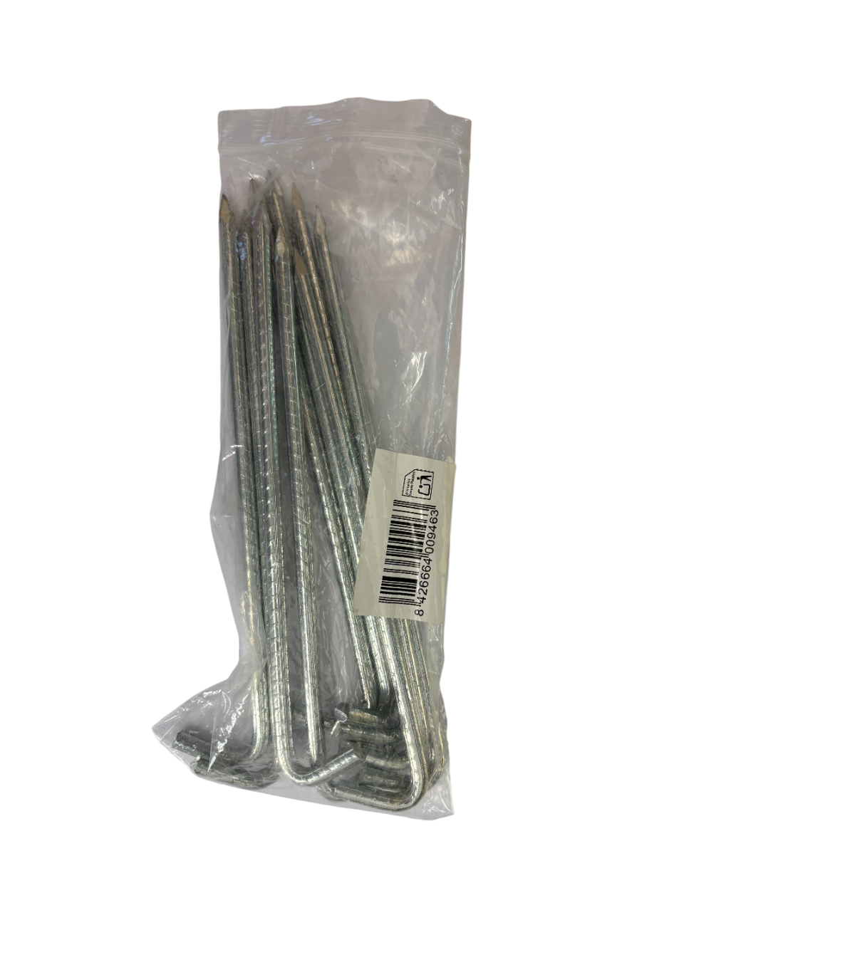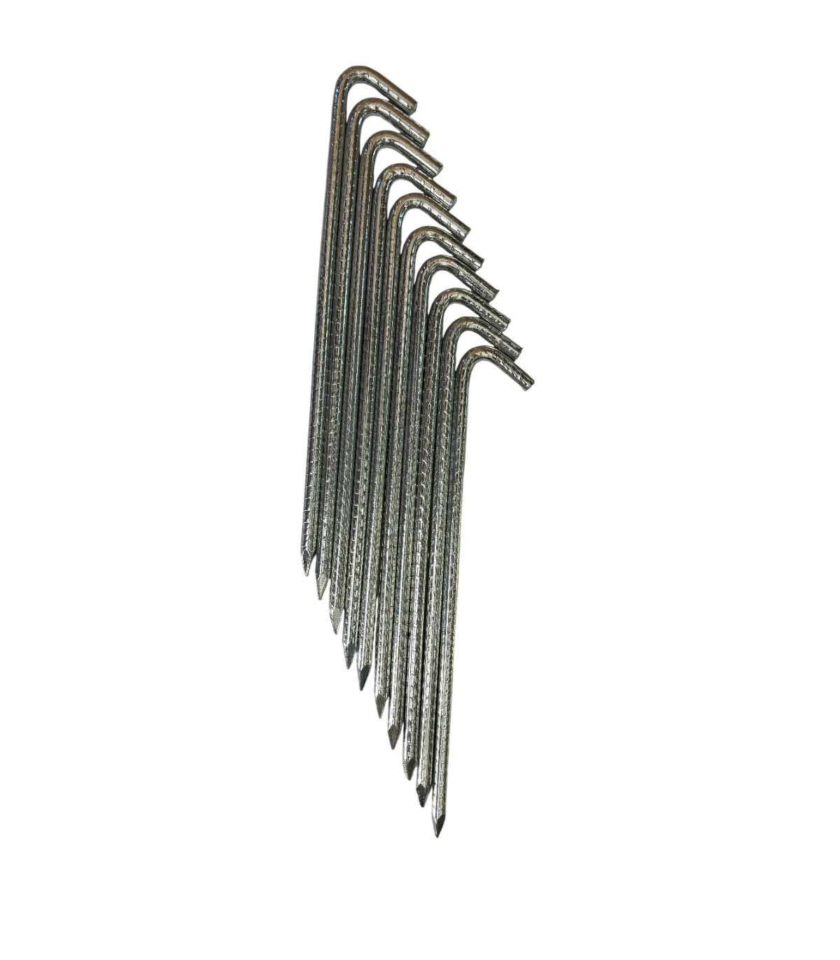 Bolsa de 10 piquetas fabricadas en acero galvanizado para fijar al suelo una tienda de campaña. Medidas: 8 x 250 mm (diámetro x largo).